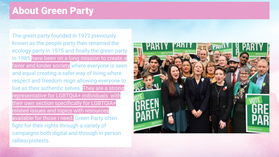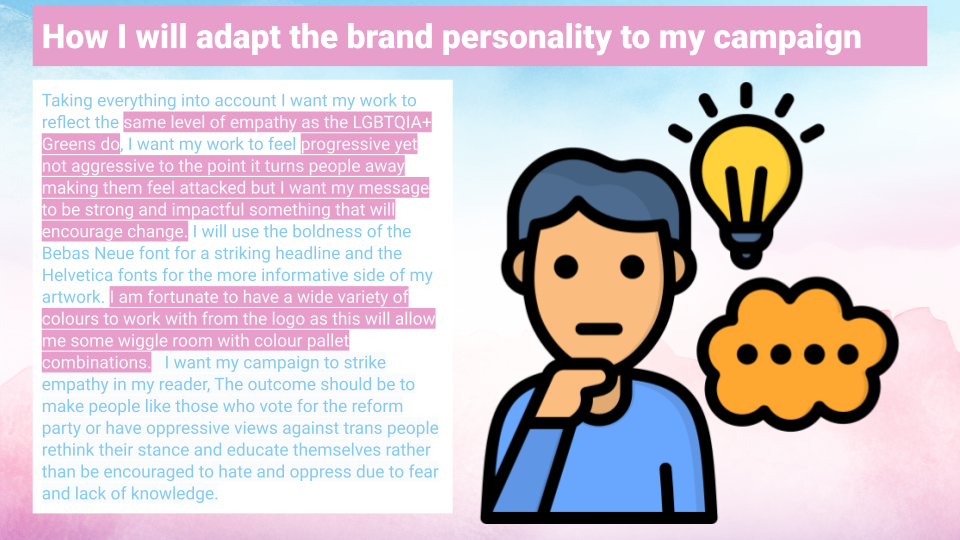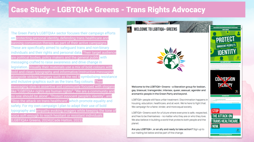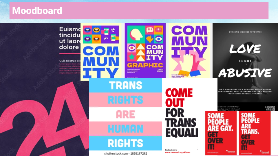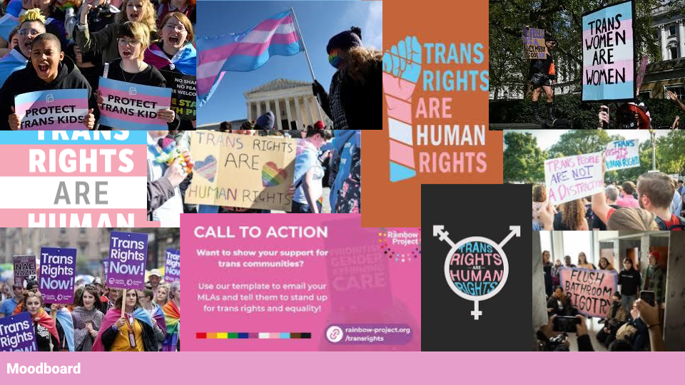 My research began with statistics on transphobia in the UK, which shaped the urgency and tone of the campaign. I explored political messaging styles, colonised design principles, and Green Party brand guidelines to understand how typography‑led communication can deliver powerful messages without relying on imagery. Moodboards and brainstorming sessions helped me refine the emotional tone and visual structure.